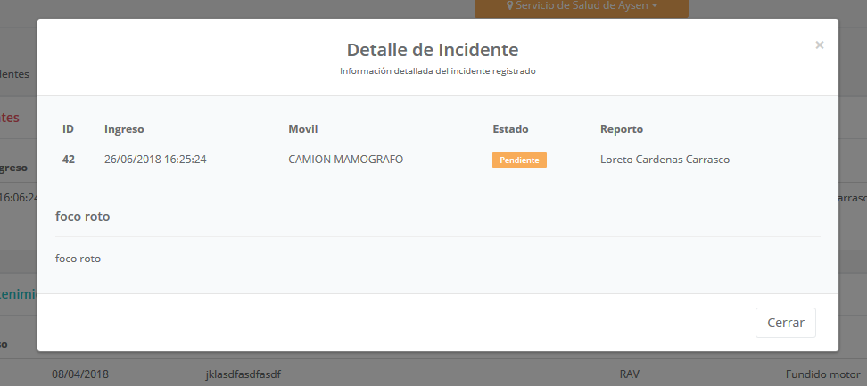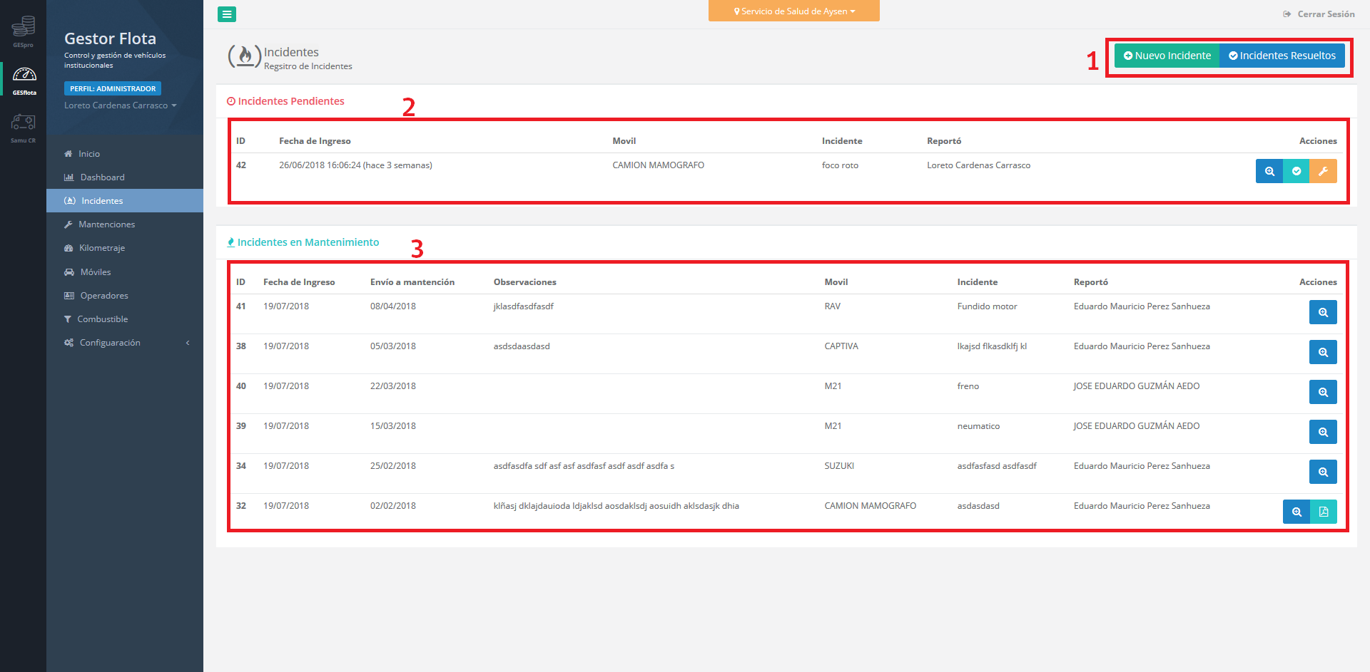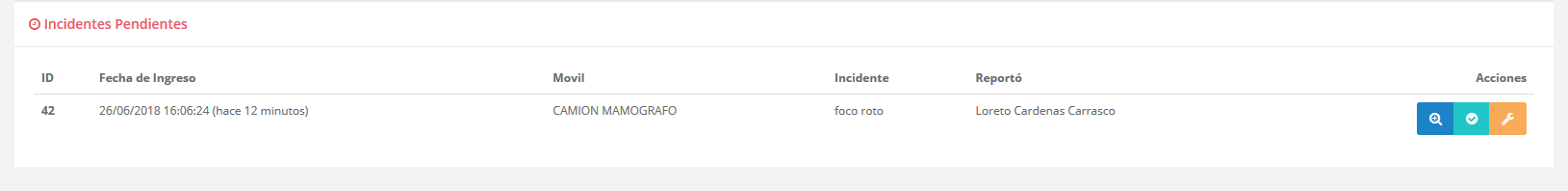 En esta sección del módulo podemos ver un resumen de los incidentes ingresados al sistema y que se encuentran pendientes
