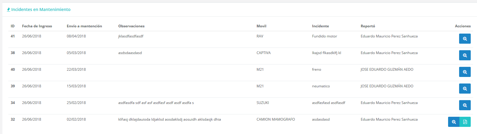 **Al ingresar a Incidentes Resueltos nos muestra un historial de incidentes resueltos, con información que no se puede editar ni modificar. Al costado de cada descripción se muestran dos acciones que el usuario puede utilizar, la primera es el "Detalle del incidente" identificada con un ícono azul con una lupa