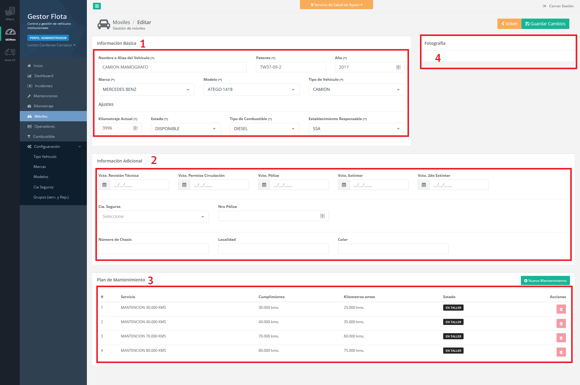 , se puede ingresar a modificar este móvil seleccionado, donde se abrirá una página mostrando el desglose de información con la cual se realizó el registro.