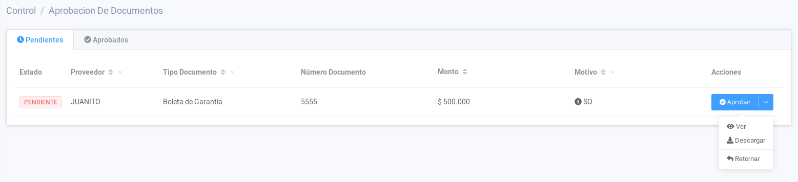 Consta de dos pestañas, la primea llamada "Pendientes" se listan los documentos que se han despachado de la Custodia y deben ser aprobados por Control para su salida. La segunda pestaña es "Aprobados" y es donde esta la lista de documentos a los que se le puede generar el oficio correspondiente.