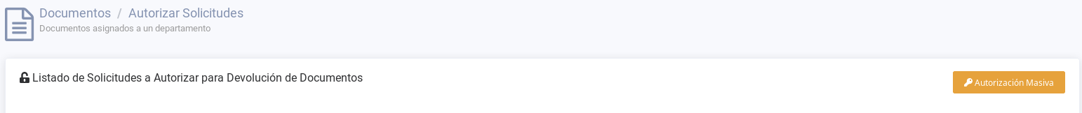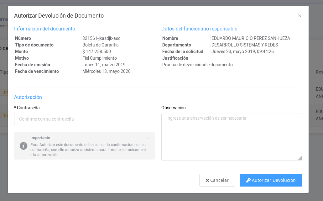Desde esta sección se permite la autorización de devolución de documentos de garantías, es decir, se permite al subdepartamento de Finanzas devuelva el documento a la empresa que emitió dicho documento. Al autorizar un documento el sistema enviará una notificación a los encargados correspondientes de Finanzas.