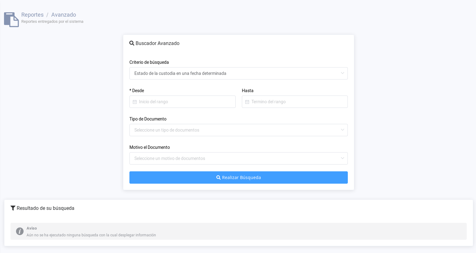 Hasta: Al ingresar este datos, hace obligatorio el ingreso del campo "Desde" y completa el rango de fechas en la que se obtendrá los documentos que están en custodia en dichas fechas.