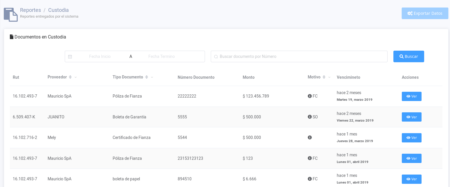 EL reporte de "Custodia" entrega los documentos que al momento del reporte se en encuentran en la custodia de Finanzas.