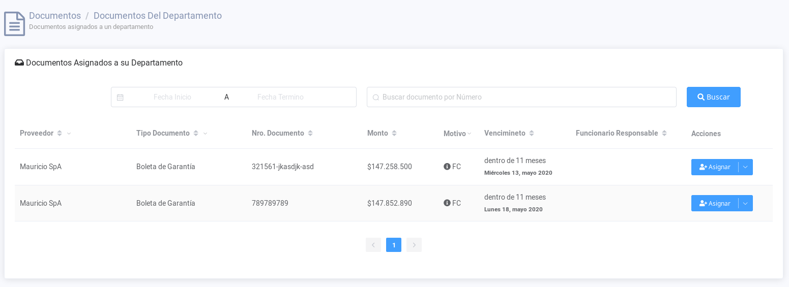 En esta sección se listan los documentos que son asignados, desde Control, al funcionario jefe de un subdepartamento, el que tiene por misión asignar estos documentos al funcionario que se encuentra a cargo del proyecto al que esta ligado el documentos de garantía.