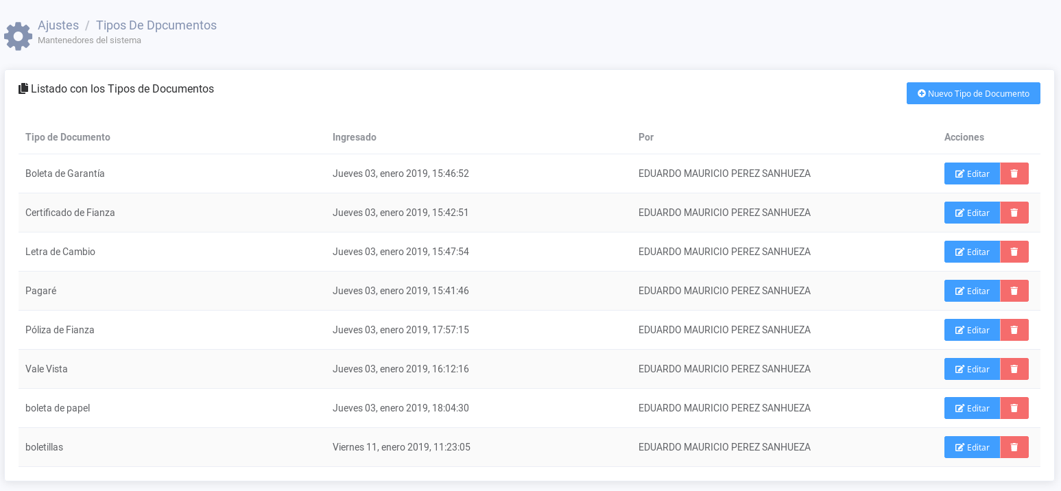 Esta acción no es posible revertirla y se permitirá eliminar el tipo de documento siempre y cuando no haya sido utilizada desde Control cuando se ingresa la información de un documento. El sistema pedirá una confirmación para continuar.