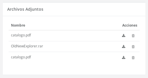 Los archivos que son exitosamente subidos, se mostraran en la lista de archivos adjuntos, donde también acciones que se pueden ejecutar.