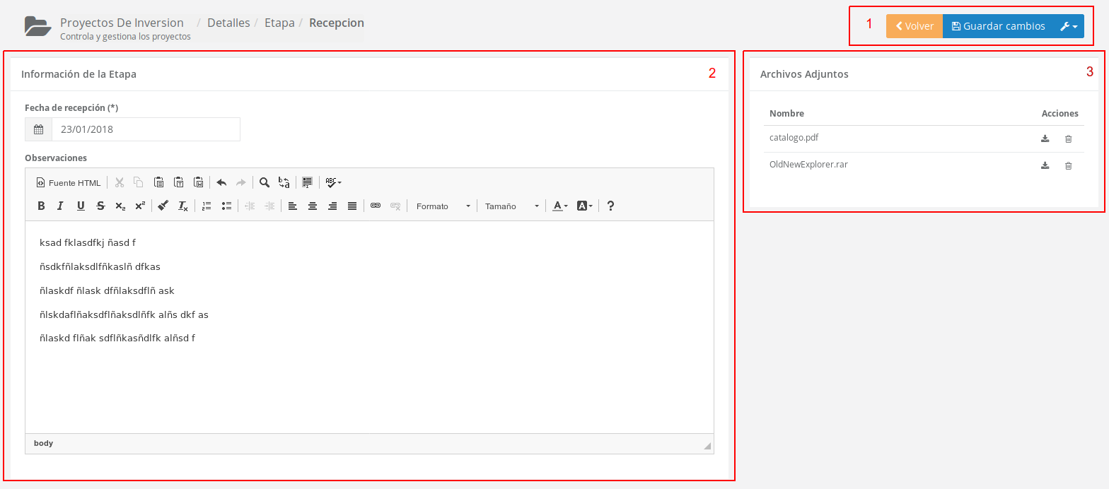 Esta etapa tiene como finalidad sentar precedente de la recepción del proyecto, para ello se dispone de un pequeño formulario y la pasibilidad de adjuntar archivos de manera de generar un repositorio de archivo referente a la etapa y proyecto en si.