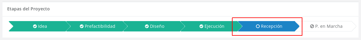 Para ingresar a esta etapa se hace a través del detalle del proyecto seleccionado la etapa de Recepción, como muestra la siguiente imagen.