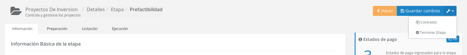 El modo de accesar a este apartado del sistema es mediante una de las etapas de Prefactibilidad, Diseño o Ejecución a través del link contratos ubicado en el menú de mas opciones