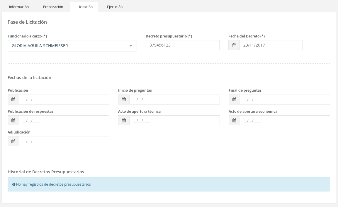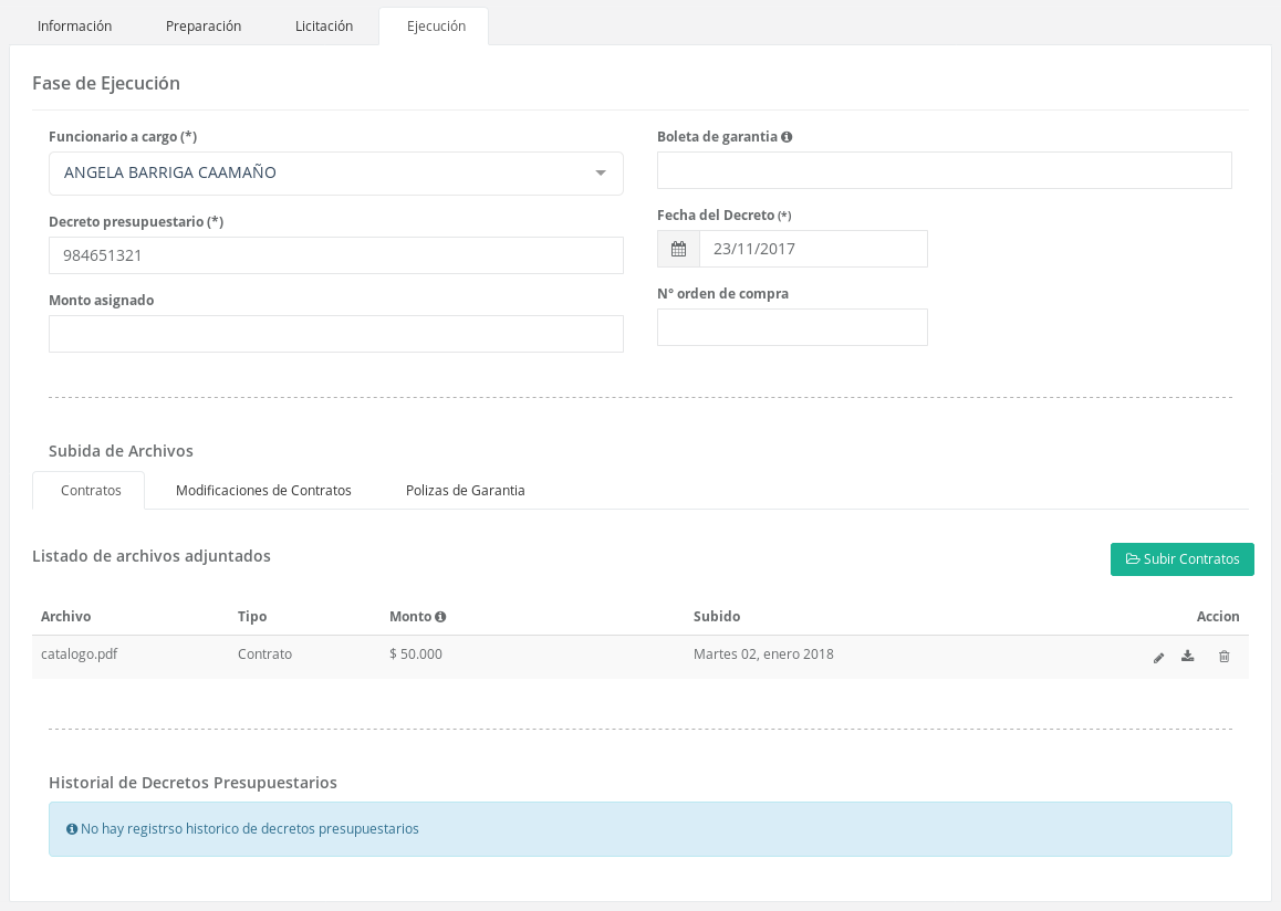 Historial de decretos presupuestarios: Tabla con la información de los decretos presupuestarios anteriores, cada vez que el decreto presupuestario o su fecha sean modificado, se guardaran los datos antiguos que se son mostrados en esta sección.