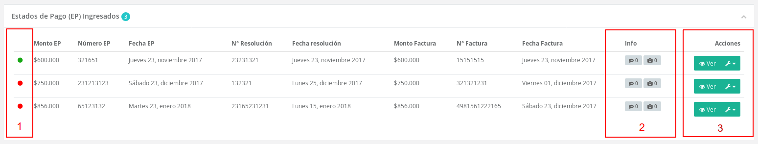 Una vez guardados lo datos, el registro aparecerá automáticamente en el listado de estados de pago, de donde se muestra información e indicadores relevantes del registro.