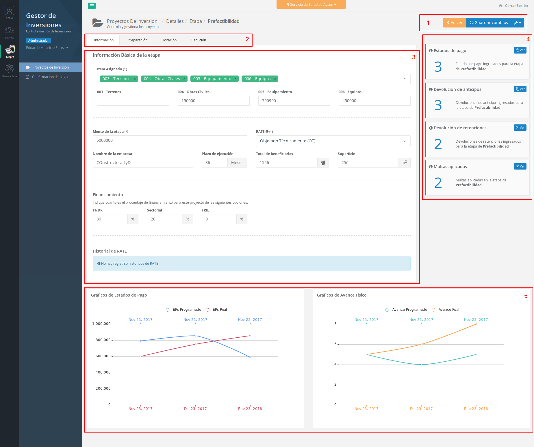 Financiamiento: Es posible ingresar los porcentajes por proyecto de financiamiento, es decir, que es posible que esta etapa este financiada por uno o mas financiamientos, es necesario dejar en 0 si un tipo de financiamiento no es utilizado.