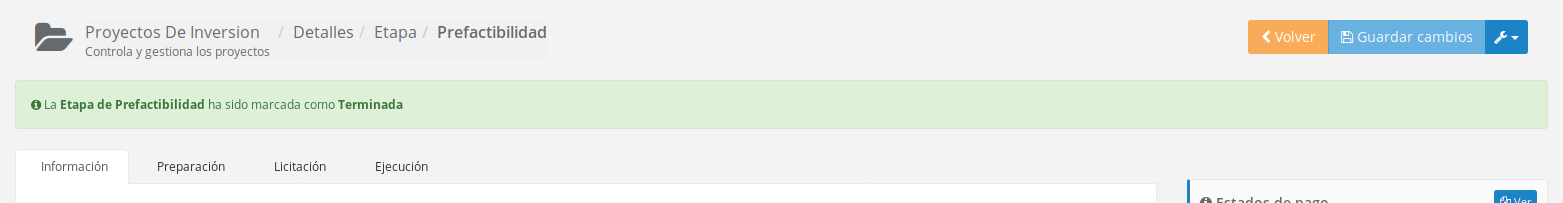 Cuando la acción sea ejecutada con éxito se mostrara una pequeña alerta visual para indicar al usuario que esta etapa esta terminada, también se bloquean opciones para evitar ingreso de información cuando la etapa ya esta cerrada.
