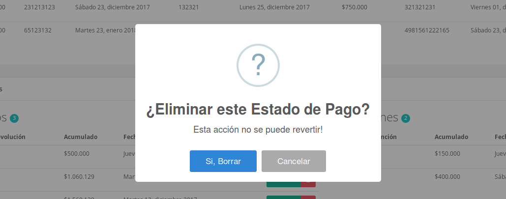 En el caso de ser requerido eliminar un estado de pago, es posible hacerlo median el link ubicado en el botón de mas opciones llamado "Eliminar", al presionar dicho link el sistema pedirá al usuario la confirmación de la operación median una alerta. Cabe mencionar que los registros eliminados no pueden ser recuperados y se eliminara todas las relaciones de información con el.