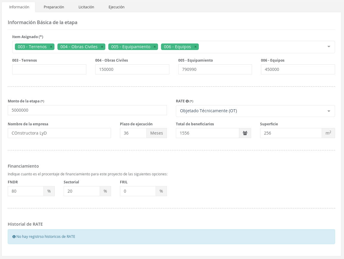 Historial RATE: Se dispone una tabla informativa acerca del historial del RATE, es decir, cada vez que se modifique este campo, en esta lista aparecerá el anterior en un orden cronológico, para saber en detalle los distintos RATE's por el que ha pasado esta etapa.