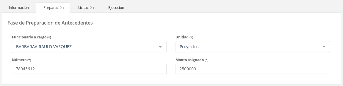 Se accede a este formulario mediante la pestaña de "Licitación" de la sección numero 2 de la pantalla.