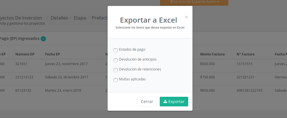 Esta funcionalidad permite extraer en formato Microsoft Excel (.xlsx) los datos que se han ingresado a contratos, pudiendo seleccionar las secciones que se incluirán en dicho reporte. Para lograr la generación del archivo Excel es necesario presionar el botón