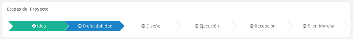 Para acceder a cualquiera de estas etapas es necesario tener en cuenta que la anterior debe haber sido marcada como terminada, donde el orden es el mostrado en la siguiente imagen y se accede presionando el botón correspondiente en la sección de detalles del proyecto.