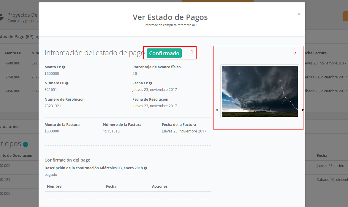 Otra funcionalidad es la confirmación de pago por parte de finanzas, una vez ingresado el estado de pago aparecerá automáticamente en el modulo de Confirmación de pagos, ademas sera posible dejar observaciones por cada estado de pago, desde el modulo de Confirmación de pagos como desde el modulo de Proyectos de inversión.