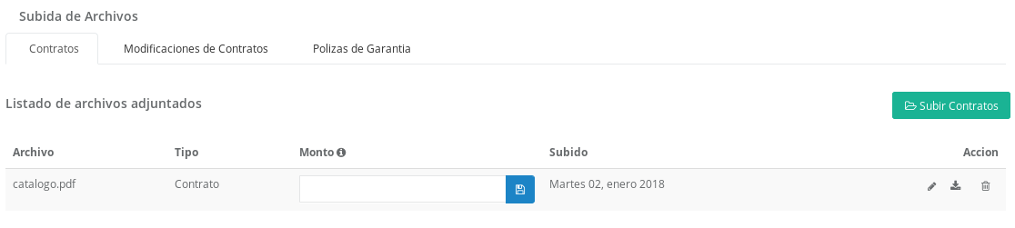 muestra un campo en la columna "Monto" donde es posible ingresar el dinero asociado al contrato, dicho dato es guardado al presionar