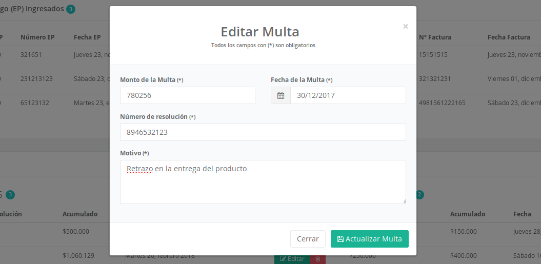 Motivo: campo de texto para describir de manera breve el motivo por el cual fue cursada la multa.