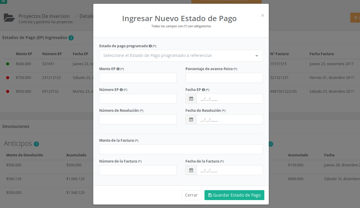 el que, entre otras opciones, cuenta con la de "Estado de pago", dicho link abrirá una ventana con el formulario que se debe llenar para guardar la información.