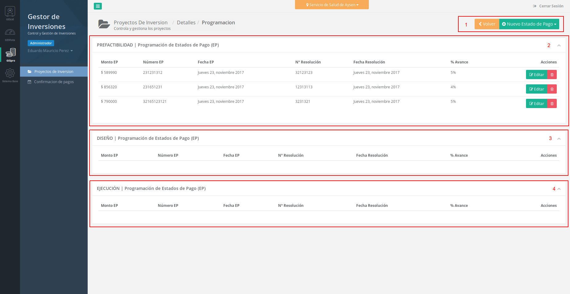 Cada proyecto tiene una programación de estados de pago, es decir, una planificación de como se pagara el proyecto, para ello esta dispuesta una sección que es accesible mediante el botón