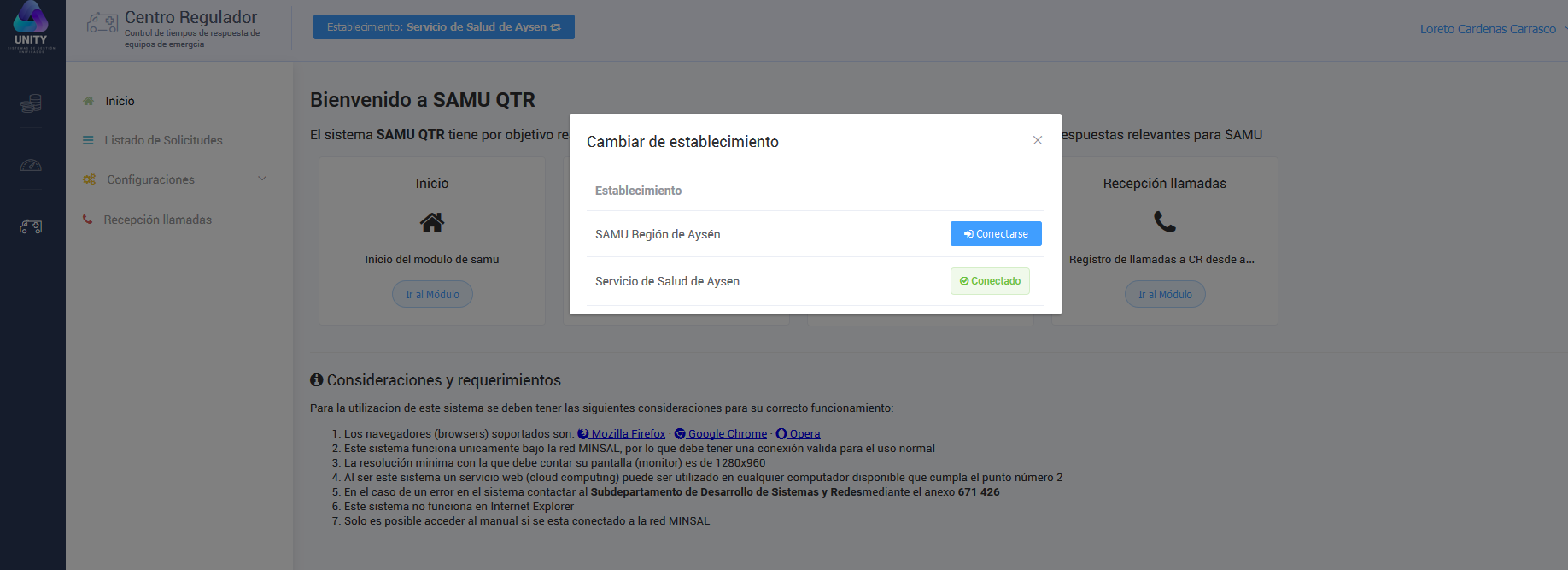 Esta acción cumple una función de entregar la posibilidad al usuario de cambiarse de establecimiento sin tener que cerrar e iniciar sesión, corresponde al botón azul que muestra el nombre del establecimiento en el que se encuentra trabajando el usuario, es muy importante tener en cuanta esto, ya que es posible que un sistema este dispuesto para varios o todos los establecimientos, lo que significa que la información es independiente por cada uno, es decir, la información no puede ser accedida por un establecimiento a otro, teniendo en cuenta lo anterior se evitara ingresar información a un sistema en un establecimiento que no corresponda.